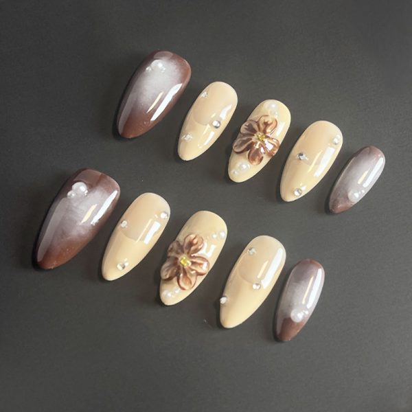 Uñas press-on en tonos marrones y beige con detalles de flores en relieve y perlas que ofrecen un estilo cálido y sofisticado, ideal para el otoño.