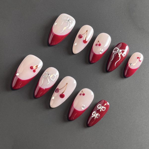 Aporta un toque de encanto con las uñas AdornU Cherry Bliss, un diseño divertido y elegante en tonos nude y cereza.