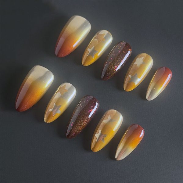 Inspírate en la belleza del cielo con el set AdornU Cielo de Fuego. Este diseño captura los tonos vibrantes de un atardecer en llamas, con un degradado en dorado, ámbar y marrón profundo, acompañado de estrellas translúcidas que parecen flotar en el diseño. Los acentos de glitter rojo oscuro añaden un toque de misterio y brillo, perfecto para quienes buscan un look audaz y enérgico.