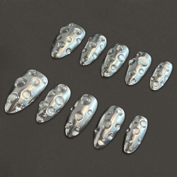 Uñas press-on con un diseño metálico plateado y detalles de gotas, ideales para un look futurista y sofisticado.