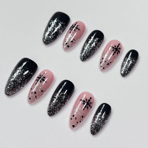 Captura la magia de la noche invernal con las uñas AdornU Midnight Snowfall, un diseño en negro, rosa y plateado con destellos de nieve.
