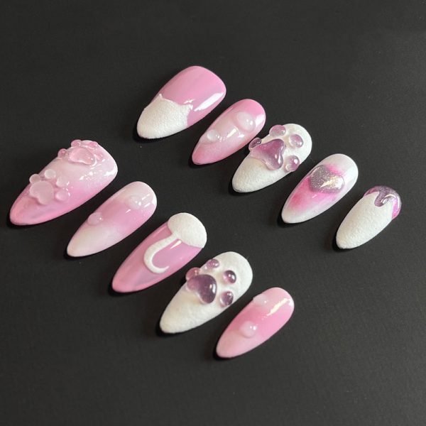 Uñas press-on con un diseño adorable en tonos rosados y blancos, adornadas con detalles de huellas y burbujas, perfectas para un look dulce y encantador.