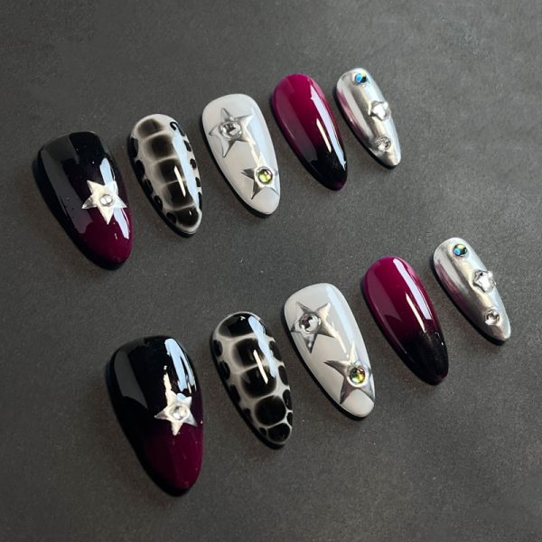 Descubre la elegancia cósmica con nuestras exclusivas uñas press-on AdornU Plated Stars Glam. Estas uñas combinan tonos oscuros de burdeos, negro y gris metálico con detalles de estrellas y piedras brillantes, creando un diseño que captura la esencia del glamour galáctico.