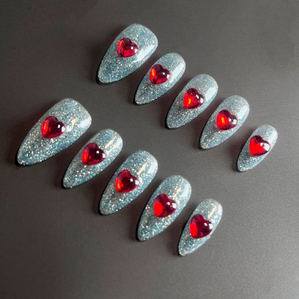Uñas press-on con un diseño brillante en tonos plateados y detalles de corazones rojos, ideales para un look romántico y glamuroso.