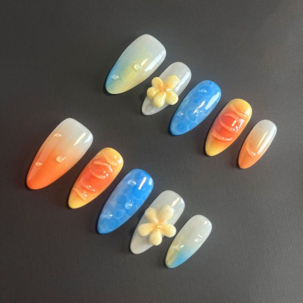 Uñas press-on con un diseño inspirado en la brisa del atardecer, combinando tonos cálidos y detalles florales para una manicura relajante y refrescante.