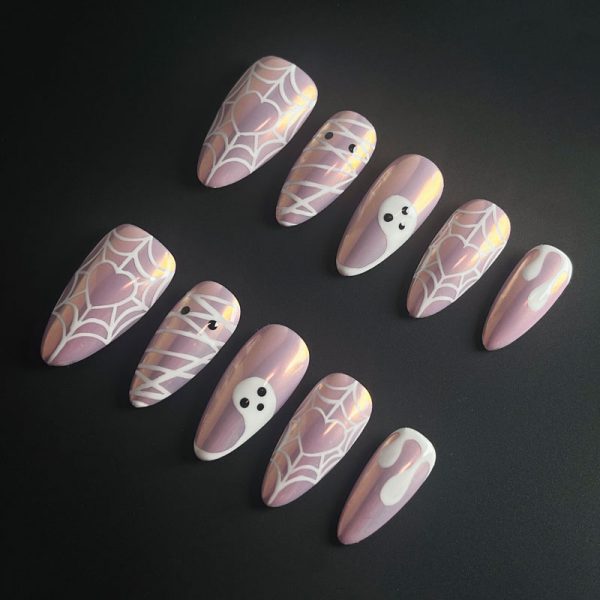 Uñas press-on en tonos suaves con detalles de fantasmas, momias y telarañas para un look encantador y fantasmal.